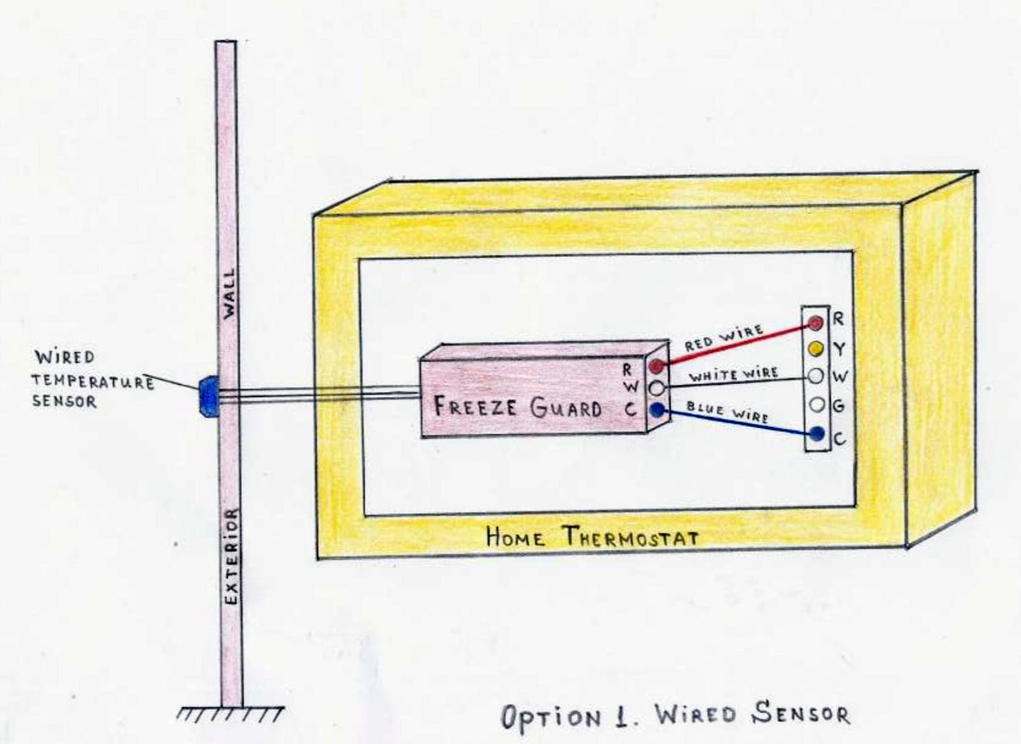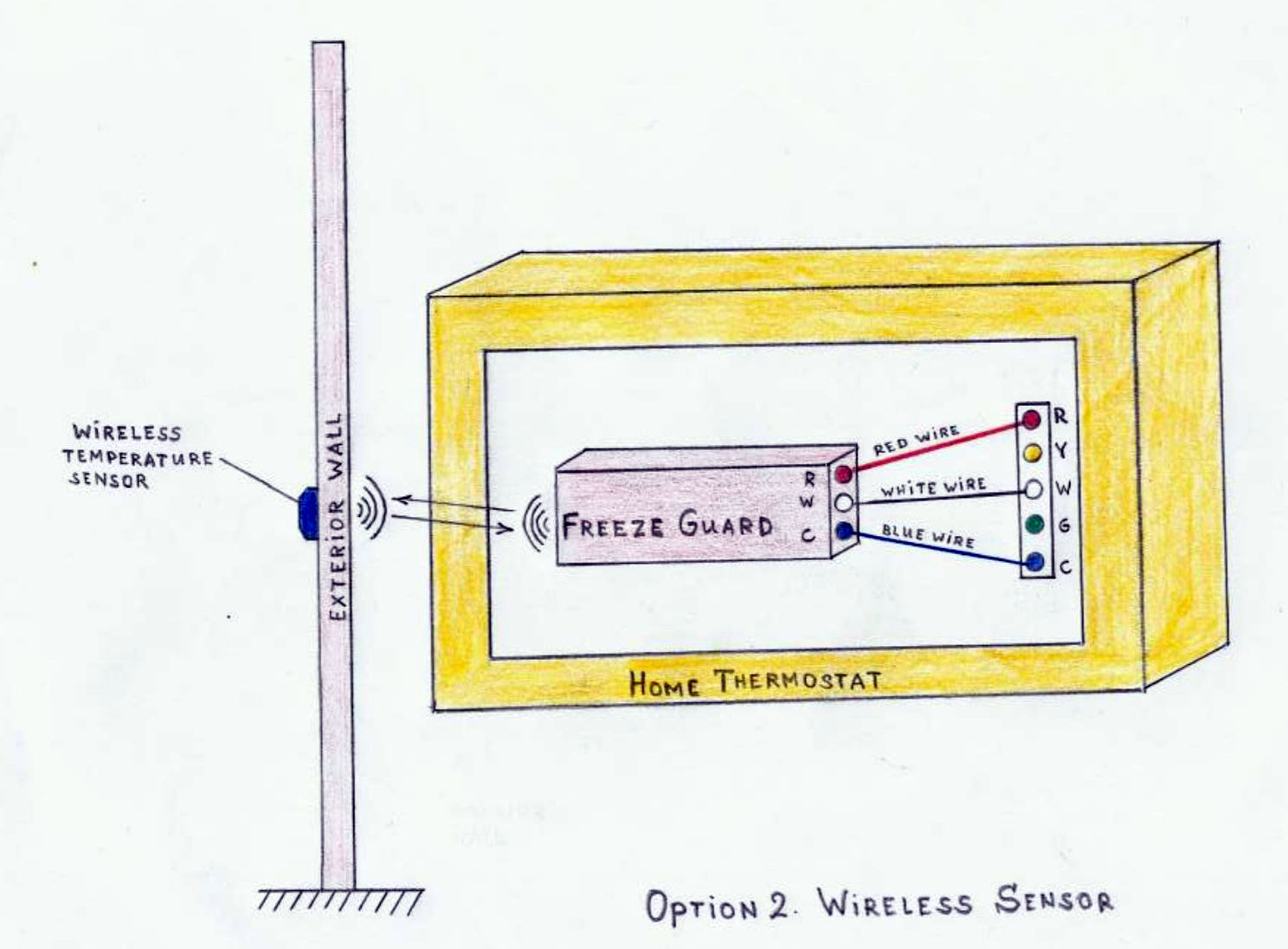 The Wireless Sensor Option is shown on the next figure. The battery-powered sensor communicates with the Freeze Guard via radio channel. Average battery life is about two years. Maximum working distance is about 100 feet. This is the preferred choice if your house does not have reliable Internet connection and your thermostat is installed on an interior(partition) wall, rendering difficult running cable to the outside.